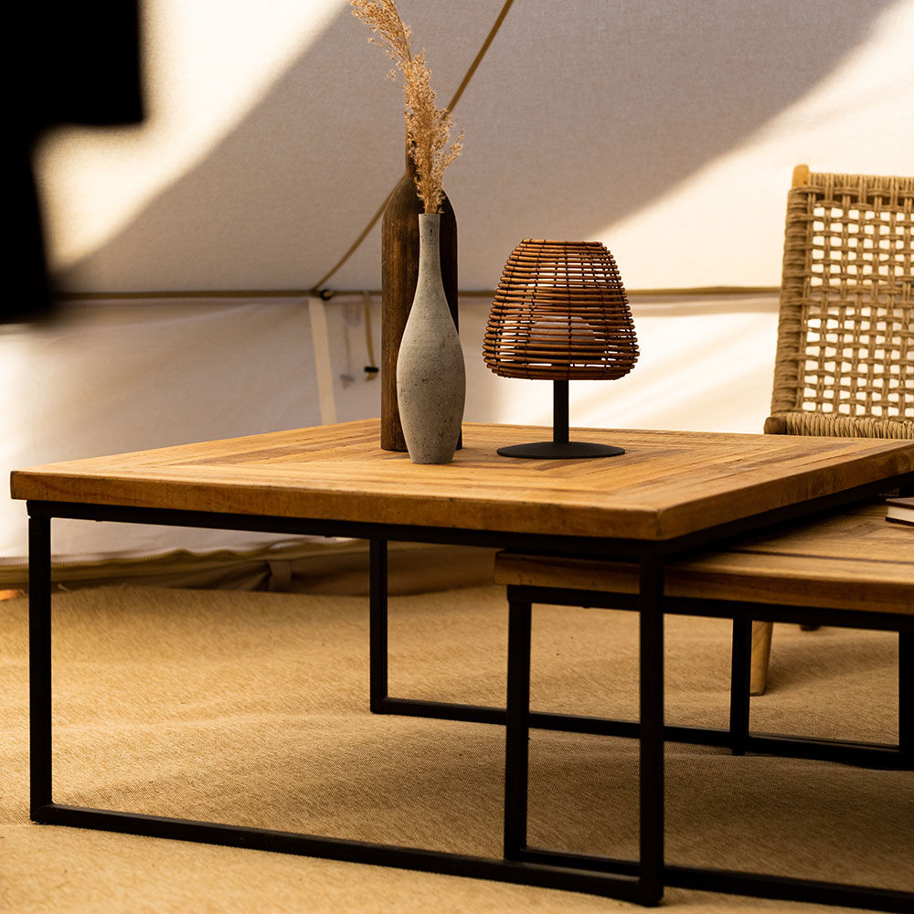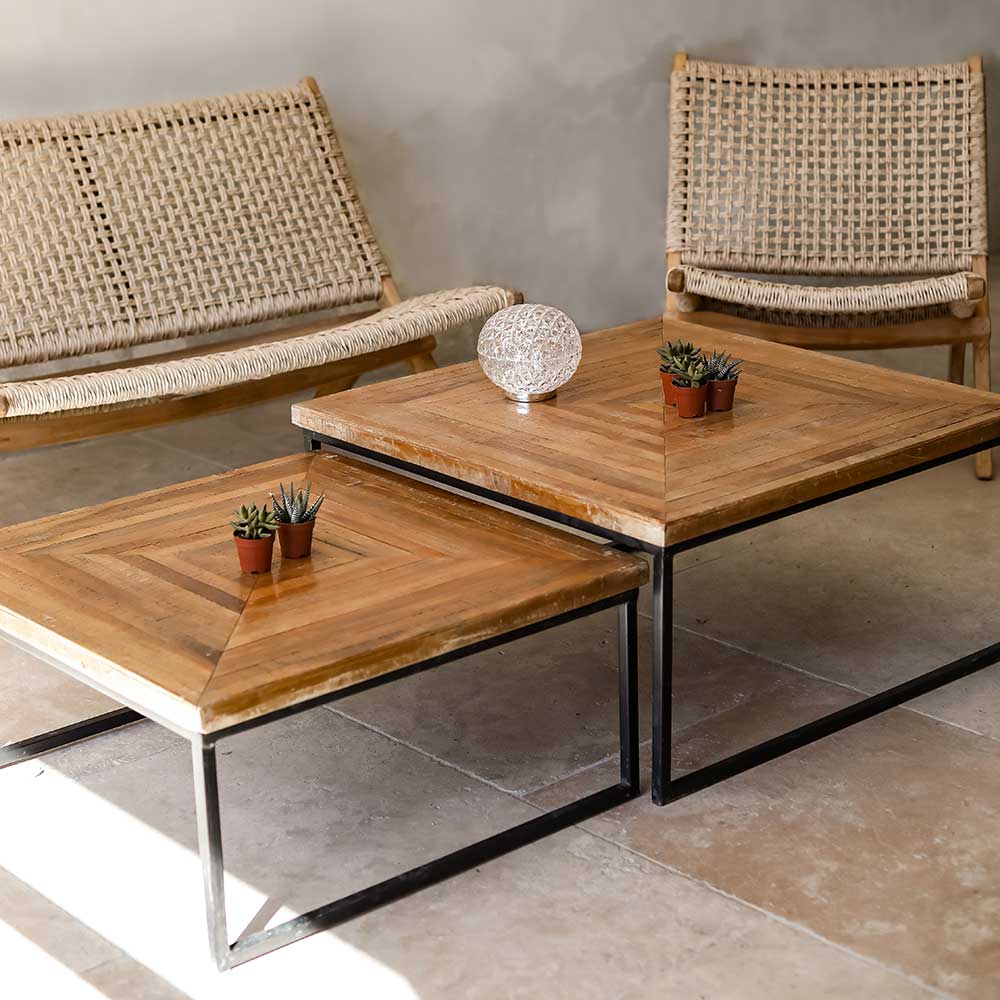 - Dimensions Élégantes : La première table mesure L 80 cm x l 80 cm x h 40 cm, tandis que la seconde mesure L 70 cm x l 70 cm x h 33 cm, offrant une variété de hauteurs et de tailles.